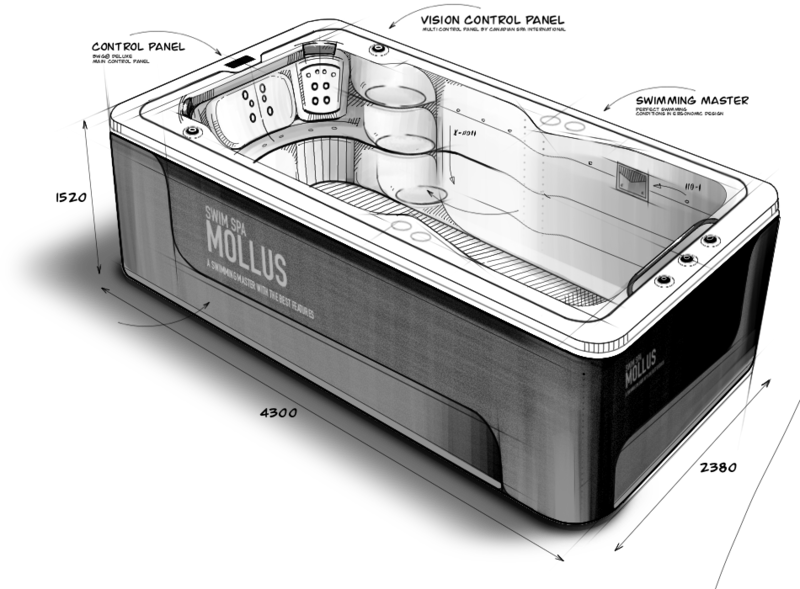 Une partie de la philosophie de développement de ce modèle a été de combiner sa partie natation et ses jeux atypiques avec une zone de massage, destinée aux périphéries des muscles du dos, du cou et des trapèzes.